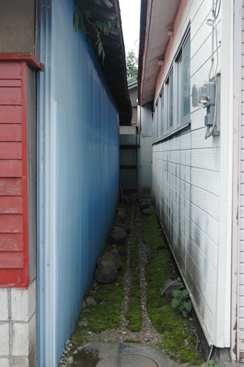 隣家同士がほどよい距離が、軒下のコケに面白い形を。