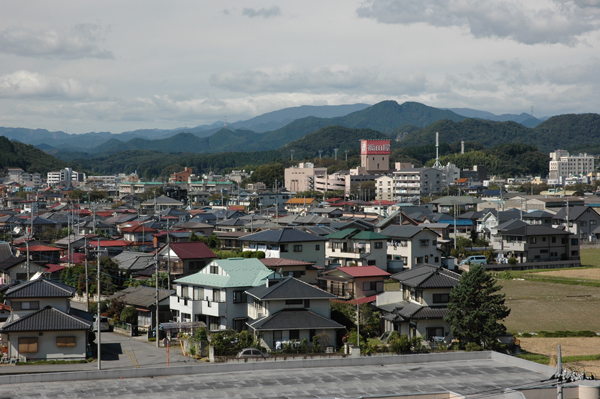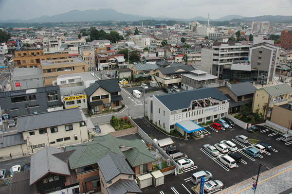 ぽつ、ぽつ、ぽつ、と見える背の高い樹木や小さな緑地。 これみんな、旧家の庭やお稲荷さんの背後を守る御神木、社寺です。 まちをコンクリートが覆い尽くそうとしている中、 緑はまちに彩りを添えています。 この写真は石橋町交差点に建つ一際高いビルの屋上からの風景。