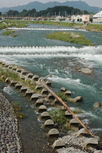 鹿沼でピクニックするといったらここ、黒川の河川敷が最適です。 普段は穏やかに水の流れる黒川ですが、最近は大雨の影響で水量も多いです。 そこで発見した杉の木。 緩衝コンクリートの上に「とーん」と乗ってしまったようです。 それにしてもよくピタっと乗ったものです。 「まだまだ足りないゼ」 と言わんばかりに波乗りしているようです。