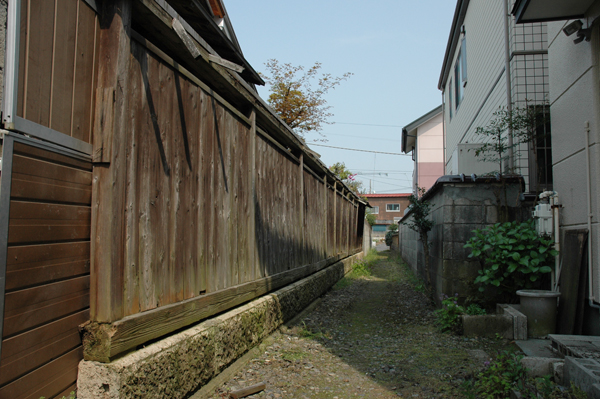 どこからどこまでがどのお宅? 近年区画整理が行われた旧市街では新しく建てる建物を旧宿場町らしく切妻屋根の妻入り形式にしましょう、とか、外壁の色を調和させましょう、とか、景観誘導の取り組みもあるようです。 でも、古絵図で見る限り、切妻屋根の妻入の建物なんて殆どないし、そんな風にしてつくられた町はどうも安っぽい。 そんな現状に比べても、最初に見た「共有する塀」の方がとっても町に溶け込んでいるし、近所の繋がりも強そうに見えます。