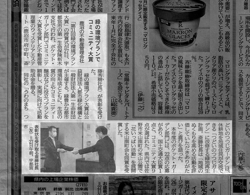 「第31回緑の環境プラン大賞」の「コミュニティ大賞」を頂戴した、うわのまちつどいのつつじガーデン、今日はその授賞式でした。 クライアントである有限会社ウィステリアエステートの皆さんと共に参加しました。 (写真クレジット、同社)