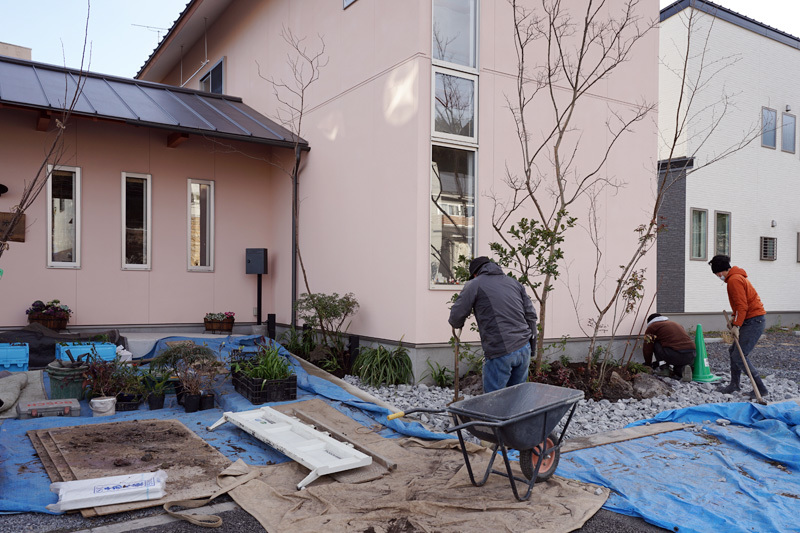 花岡のカフェ+住まいで、脇本グリーンさんの植栽工事が進んでいる.