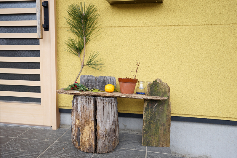家人が、庭で採れるもので仕立てた正月飾り、