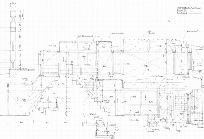 雪ちらつく中、解体を控えた江戸期創業の旅館を実測する. 昔から知っている建物の解体が多いこの頃、記録だけでも残しておきたい.