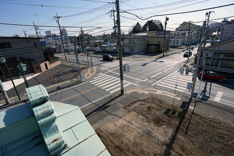 解体される町家の屋根から、市役所前交差点を見る. なぜこの屋根の上に乗っているかというと、ある日、市の文化課の僕より若い職員が突然事務所に来、 数日後に解体予定だから一緒に行きませんかと声をかけてもらったのだ.