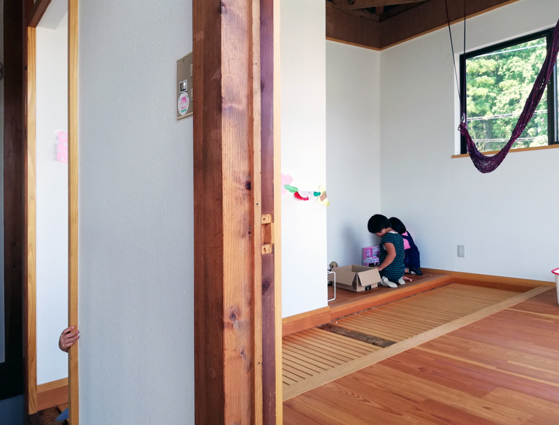 日吉の住まい+yae.のそこここにある凹みやトンネルを見つけては子どもたちはさまざまな遊びを発明している、 人間の動物的本能が設計者にも想定されていないこの建築の質を日々教えてくれる.