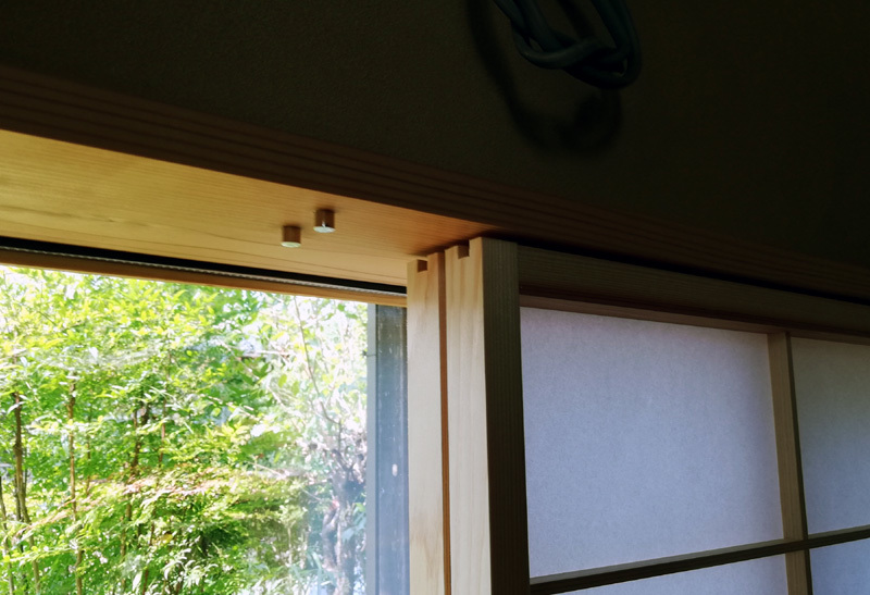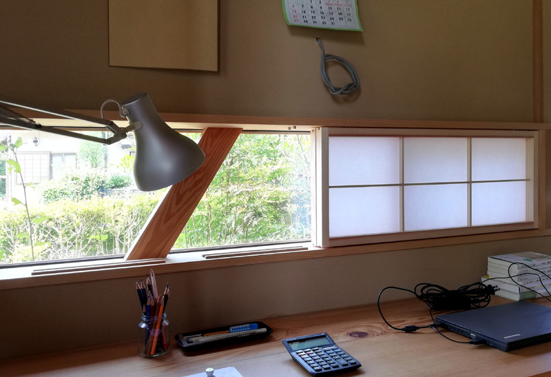 坂の上スタジオと住まいのスタジオの道路際開口部、今まで透明ガラスのみで西日が激烈だったので、障子を入れることになった. 障子を建て込むための溝を、通常なら開口枠に設けるが、厚みがなく掘れない、 ここでは、下枠にスライドガイドとなる凸敷居、上枠には倒れ防止の家具用金属ダボを打ち込み、 障子に掘った溝がそれらを滑るようにした.