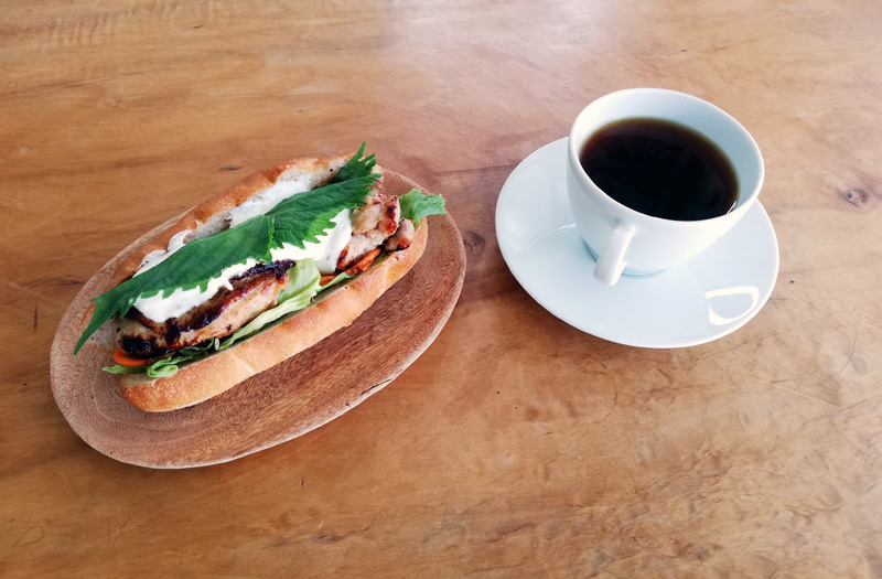 昼食に、隣からコブルさんが運んでくれたチキンサンド&コーヒー、