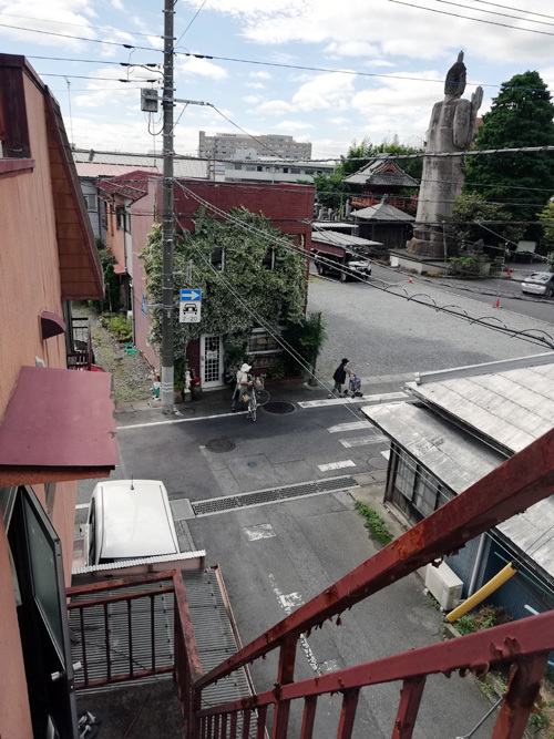 改修設計スタートの実測中、屋外階段からのT字路世界の一瞬が鹿沼の質を説明している、 末広町旧洋品店、事務所から徒歩1分. ここは食堂を中心にした複合空間になる予定である.