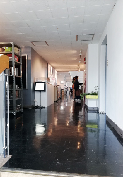 開いたドアの隙間から察するに、そこはスタッフが使用するデザイン室なのか製作室なのか料理の試作室なのか、いずれにしてもスタッフルームのようである.