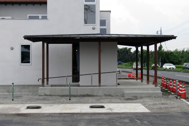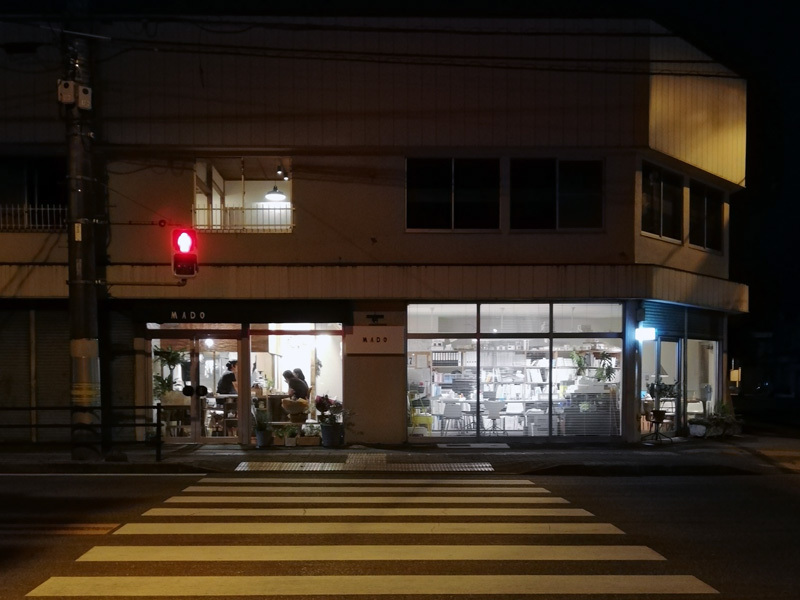 路面は柱を除いて全てがガラスサッシで、白のブラインドが下りている.